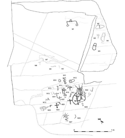 Lieu : Outeiro Machado Val d'Anta - NORD - - PORTUGAL Altitude = m lat: 41.7553301, long: -7.5137374 qualité de la position : "2", afficher sur la carte 221 cruciformes, 129 cupules, 110 cuillères, 41 fers à cheval, 18 palettes et 5 haltères. Rédacteur : P. Pannetier Site web : https://ojs.letras.up.pt/ojs/index.php/tae/article/viewFile/8991/8251 | ![]() |